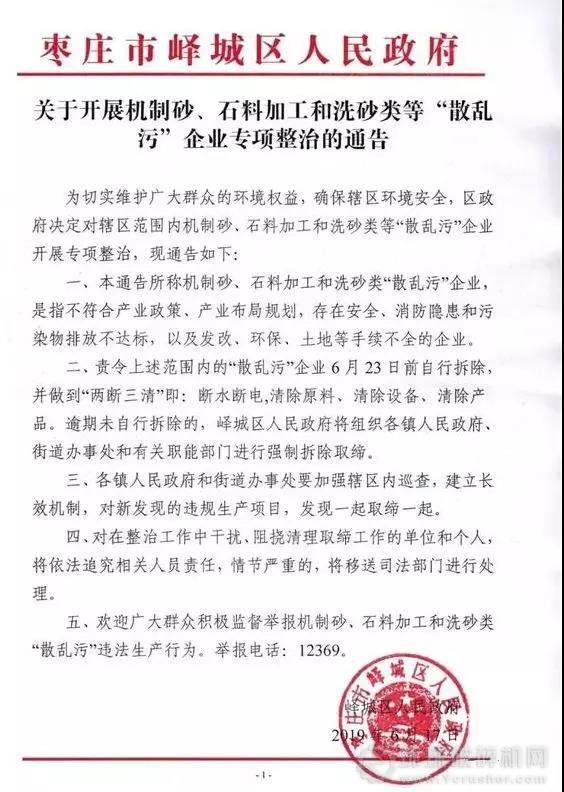 6月17日,山東省棗莊市嶧城區發布通告,決定對轄區范圍內機制砂、石料加工和洗砂類等“散亂污”企業開展專項整治,要求“散亂污”企業于6月23日前自行拆除,逾期未自行拆除的將強制拆除取締。