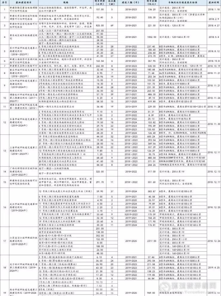 小編整理出了國家發改委正式批復軌交項目清單(2018.1.1-2019.6.20),并對獲批項目的具體的線路、項目里程、站點數量、建設工期、項目投資金額以及車輛及運行速度技術標準也進行了全部統計,信息量大,內容重要,建議收藏!