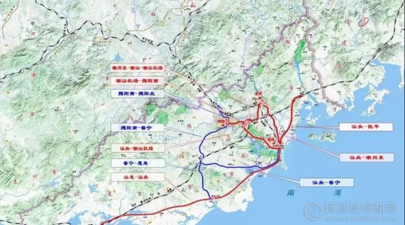 近期規劃建設“一線一環一射線”,即汕尾-汕頭-饒平、汕頭-潮州東-潮汕-潮汕機場-汕頭、潮汕機場-揭陽南城際鐵路,總里程320公里,總投資約691.9億元。未來形成以汕頭、汕尾、潮州、揭陽為主要節點、覆蓋粵東地區主要城鎮的城際鐵路網絡,實現汕潮揭地區中心城市“半小時通勤圈”和粵東地區“一小時交通圈”,為粵東地區提供公交化的快捷城際旅客運輸服務。遠期規劃形成“一線兩環兩射線”為骨架的城際鐵路網絡,總里程460公里。其中,“一線”為汕尾—汕頭—饒平城際鐵路,“兩環”包括汕頭—潮州東—潮汕—潮汕機場—汕頭、汕頭—潮汕機場—揭陽南—普寧—汕頭城際鐵路,“兩射線”包括潮汕機場—揭陽南—揭陽北、普寧—惠來城際鐵路,規劃項目總投資約1002億元。