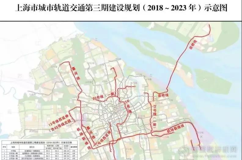 上海市城市軌道交通第三期建設規劃包含19號線、20號線一期、21號線一期、23號線一期、13號線西延伸線、1號線西延伸線6條地鐵線及機場聯絡線、嘉閔線、崇明線3條市域鐵路,總長度286.1公里。項目建成后,形成27條線路,1154公里的軌道交通網絡(含市域鐵路342公里)。初步估算項目總投資約 2983.48 億元。