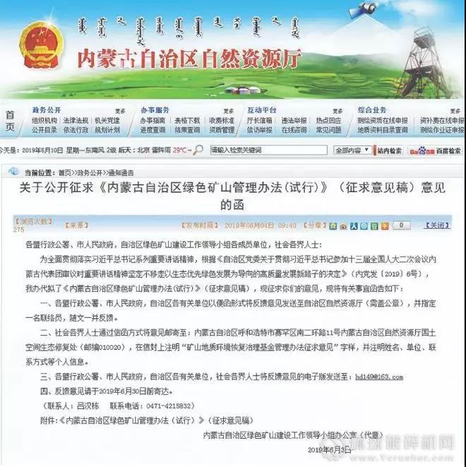 日前,內蒙古自然資源廳發布《內蒙古自治區綠色礦山管理辦法(試行) (征求意見稿)》,明確了綠色礦山建設、評估、名錄管理、綠色礦山評估專家及第三方評估機構管理等內容,并提出到2025年,全部達到綠色礦山建設標準,不符合綠色礦山標準的礦山企業由旗縣級人民政府綜合運用法律和經濟手段,依法實施關閉。