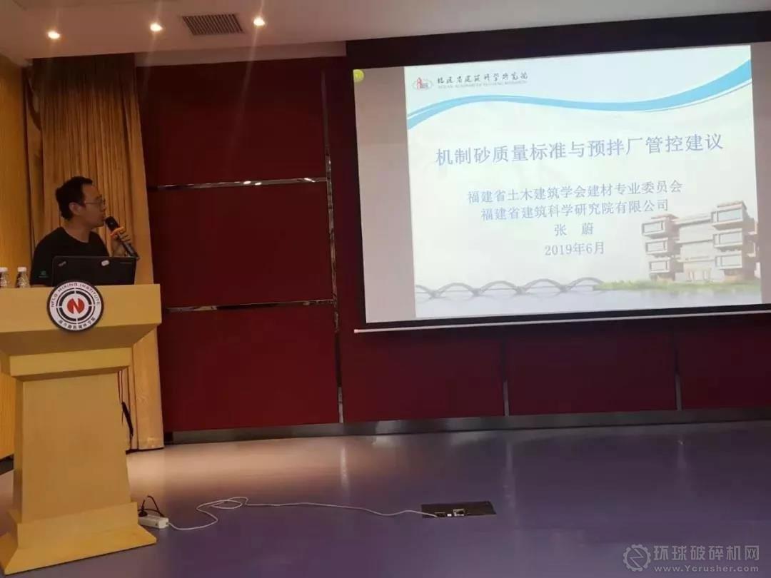 福建省建筑科學研究院材料測試分析研究所副所長周敏代表所長張蔚作《機制砂石質量標準與預拌廠管控建議》的主題演講。