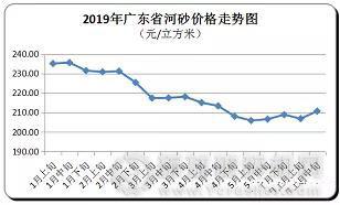 6月中旬,全省河砂平均購進價為每立方米211元,環比上升1.86%(與2019年6月上旬相比,下同)。其中,粵北和珠三角地區購進價分別為每立方米215元和199元,環比上升0.62%和6.55%。粵西和粵東地區價格環比持平。