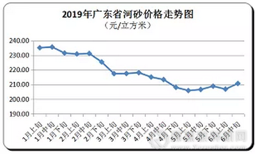 6月中旬,全省河砂平均購進價為每立方米211元,環比上升1.86%(與2019年6月上旬相比,下同)。其中,粵北和珠三角地區購進價分別為每立方米215元和199元,環比上升0.62%和6.55%。粵西和粵東地區價格環比持平。