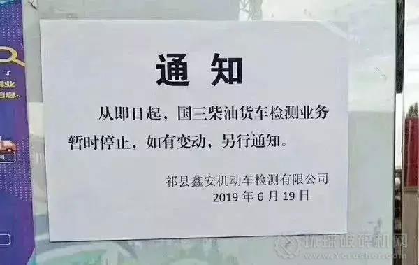 6月19日,山西祁縣鑫安機動車檢測有限公司張貼通知:從即日起,國三柴油貨車檢測業務暫時停止,如有變動,另行通知。