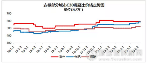據了解,安徽主流城市混凝土價格整體保持高位偏強的態勢。具體來看,皖北亳州地區混凝土價格偏高,截止目前19年均價在594.3元/方;皖中合肥混凝土價格低于皖北,均價在553元/方;皖南銅陵混凝土價格偏弱,均價在475元/方。19年4-6月份安徽省混凝土價格上漲明顯,其中合肥地區混凝土累計上漲30-40元/方,目前市場含稅非泵送價格在585-600元/方的高位。