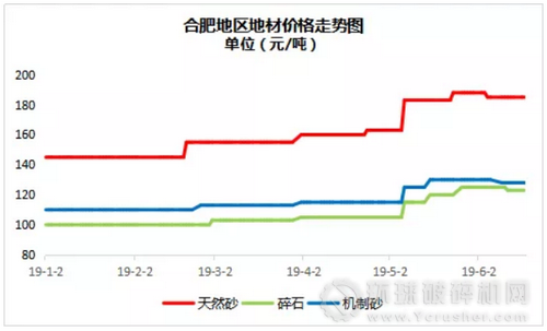 19年上半年合肥地區天然砂、碎石以及機制砂價格普遍上漲: