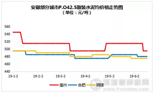 以上圖看出亳州、合肥、銅陵地區19年上半年的P.O42.5散裝水泥水泥價格走勢,其中皖北亳州地區水泥價格偏高,震蕩運行,均價在510.9元/噸;皖南銅陵地區水泥價格適中,波動較小,均價在485元/噸;合肥地區水泥價格相對偏低持穩為主,均價在483元/噸。6月份市場需求回落,預計后期水泥行情穩中走弱。