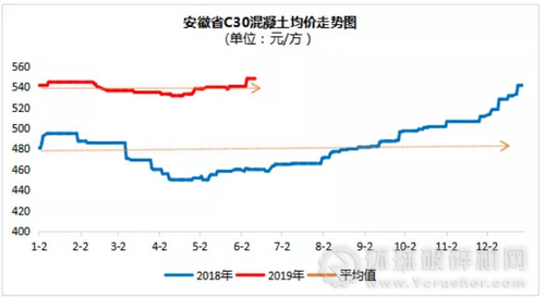 從上圖來看,2018年安徽省混凝土行情震蕩偏強運行,C30混凝土去年均價在482.04元/方。第一季度混凝土行情持續回落;第二季度均價低于平均水平;三四季度持續上漲且超出平均水平,全年振幅高達91元/方。2019年上半年混凝土均價保持高位偏強運行趨勢,均價在539.36元/方,同期同比上漲33.88%。