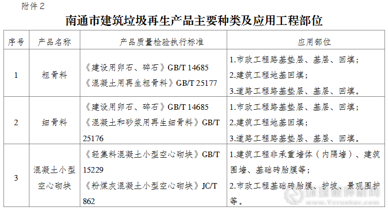2.規(guī)定使用比例。縣級以上政府財政性資金及國有單位資金投資控股或占主導地位的房屋建設、市政園林、道路交通、河道水利等建設工程(以下簡稱政府性工程),在滿足相關技術標準和設計規(guī)范要求前提下,按照《南通市建筑垃圾再生產品主要種類及應用工程部位》(附件2)要求,率先使用再生產品,指定工程部位選擇的再生產品替代使用比例不低于8%,再生產品價格不高于市場指導價。本市混凝土企業(yè)生產C25及以下強度混凝土的,應按照住建部《再生混凝土結構技術標準》(JGJ/T443-2018)相關要求,在確保質量基礎上,合理使用再生骨料。