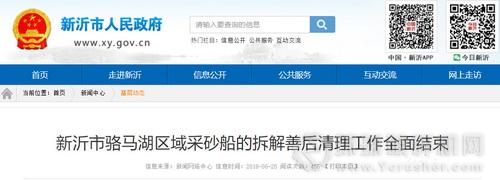 據新沂市政府官網2018年6月25日報道,新沂市駱馬湖區域采砂船的拆解善后清理工作全面結束。