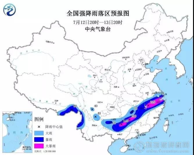預計,7月12日20時至13日20時,江蘇南部、上海、安徽南部、湖北東南部、浙江中北部、江西中北部、湖南中南部和東北部、廣西北部、貴州中南部、云南西部、西藏東南部等地的部分地區有大到暴雨,其中,安徽東南部、浙江北部、江西東北部、湖南南部、廣西東北部等地局地有大暴雨(100~220毫米),上述部分地區伴有短時強降水(最大小時降水量20~50毫米,局地可達70毫米以上)、局地有雷暴大風等強對流天氣。