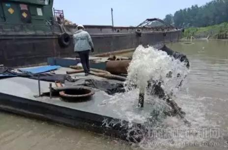 執法人員立即征調帶有電瓶的運輸船舶來到現場,將撈上來的插頭通電后,水面立即翻滾起來,有水向上冒,從當天上午十點到下午3點多,經過大約6個小時的排水,一艘潛水式采砂船浮上水面。此潛水式隱形采砂船大約長30米,寬7米,高1米左右,船體全部封閉,砂槍插入水底。