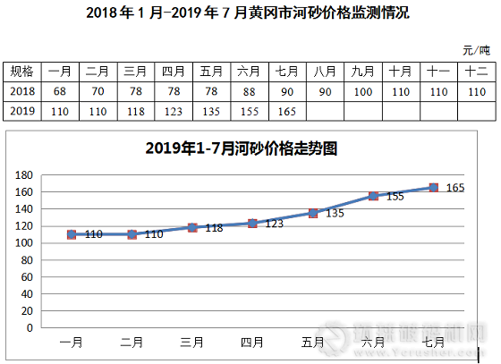 據監測:7月河砂價格165元,比上月155元上漲10元,漲幅6.45%;比去年同期90元上漲75元,漲幅83.33%。