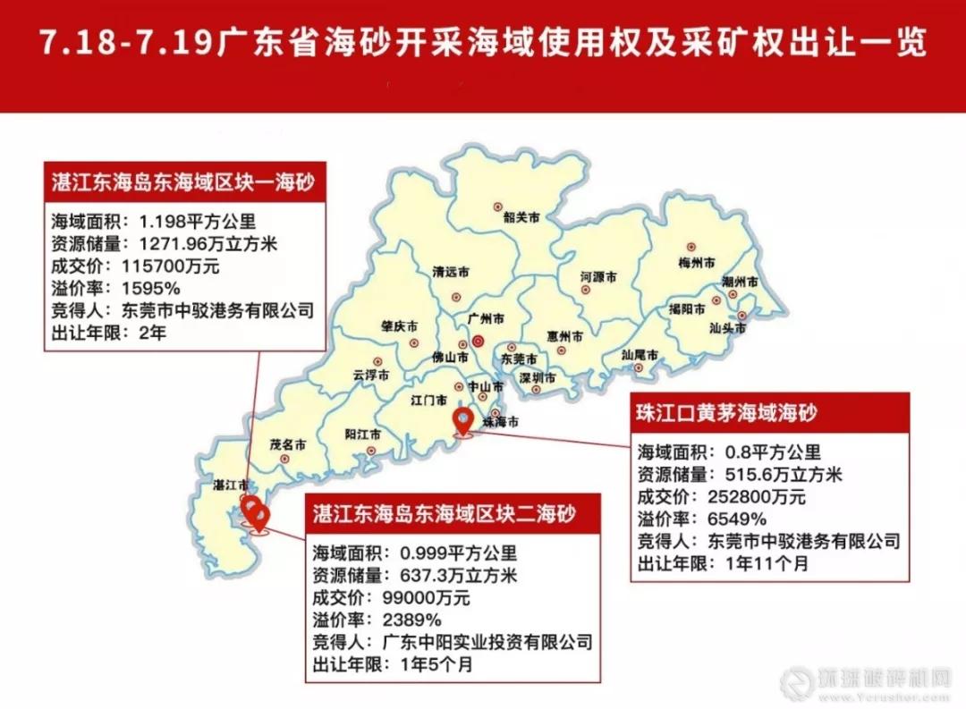 從上可知,黃茅海域海砂開采權被東莞市中駁港務有限公司拍得,湛江東海島東海域二塊海砂開采權被廣東中陽實業投資有限公司拍得。