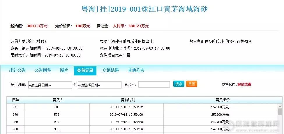從2019年5月8日廣東省自然資源廳在官網發布《廣東省自然資源廳掛牌出讓海砂開采海域使用權采礦權預告》起,截至2019年7月19日在廣州土地礦業權網上交易系統中“棒槌”落下。