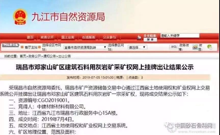 此前,九江市自然資源局在其官網發布《瑞昌市鄧家山礦區建筑石料用灰巖礦采礦權網上掛牌出讓結果公示》。中國建材集團子公司中建材新材料以12.1億元將該采礦權收入囊中。