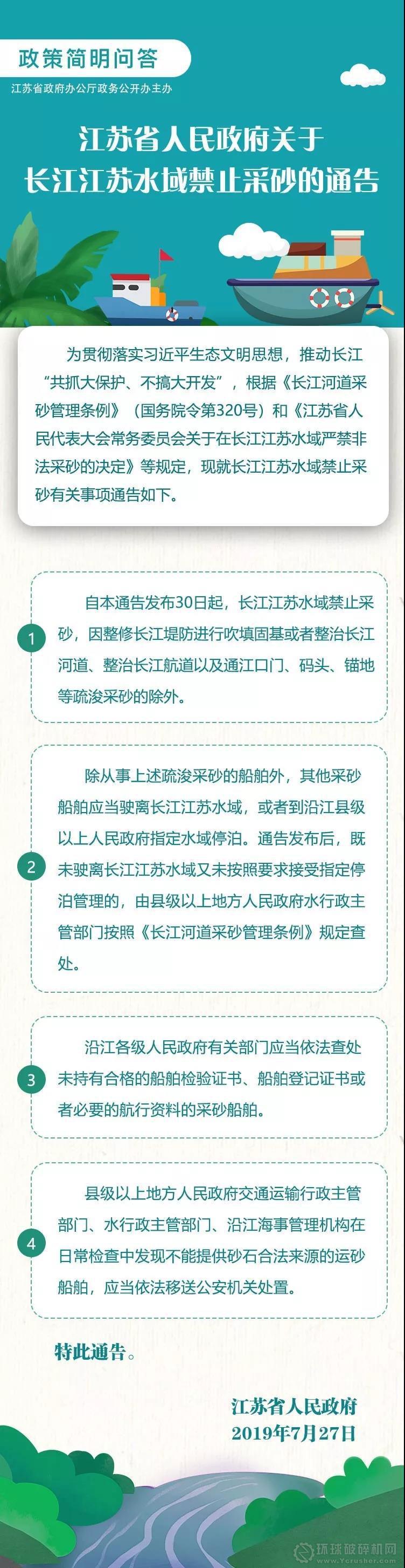 近日,江蘇省人民政府發布關于長江江蘇水域禁止采砂的通告:自通告發布30日起,長江江蘇水域禁止采砂,采砂船舶應當駛離長江江蘇水域,或者到沿江縣級以上人民政府指定水域停泊。