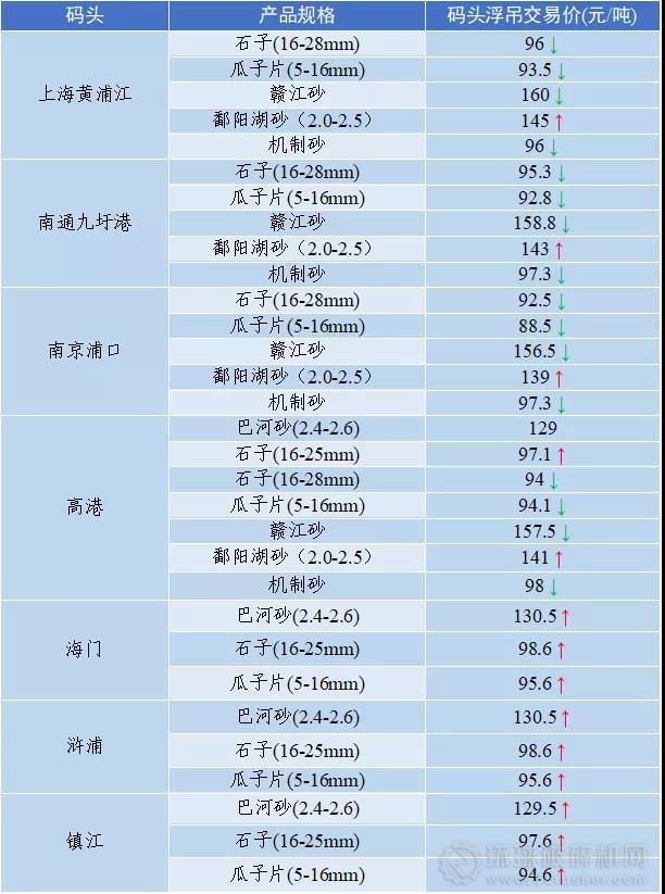 長江中下游重點城市砂石價格普遍維持高位,長沙市機制砂120元/噸、黃砂粗砂150元/噸,上海地區河砂最高價152元/噸,南通河砂最高價158.8元/噸;