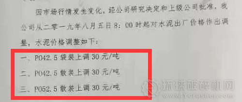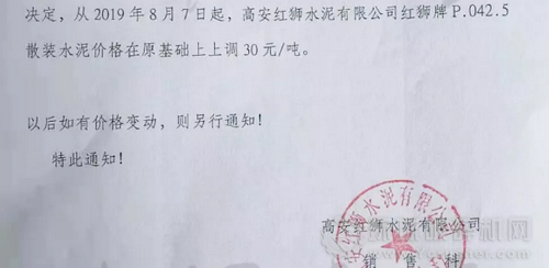 在此之前,江西上高南方水泥有限公司發布價格調整通知單,稱因市場行情發生變化,經公司研究決定和上級公司批準,公司從2019年8月5日8:00起,對水泥出廠價格做出調整,水泥價格調整如下,PO42.5袋裝上調30元/噸;PO42.5散裝上調30元/噸,PO52.5散裝上調30元/噸。