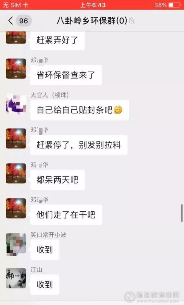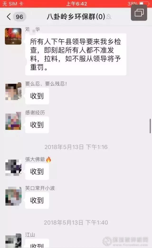 在李先生提供的微信群聊天記錄截屏中,新京報記者看到,5月13日13時14分,一名為“八卦嶺鄉環保群”中,鄧某華發言稱,“所有人,下午縣領導要來我鄉檢查,即刻起所有人不準發料,拉料,如不服從領導將予重罰。”隨后所有人回復“收到”。