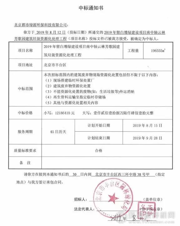據(jù)了解,日前,北京都市綠源環(huán)保科技有限公司成功中標2019年留白增綠建設項目南中軸云林芳歌建筑垃圾資源化處理項目,該項目總工程量約20萬方!