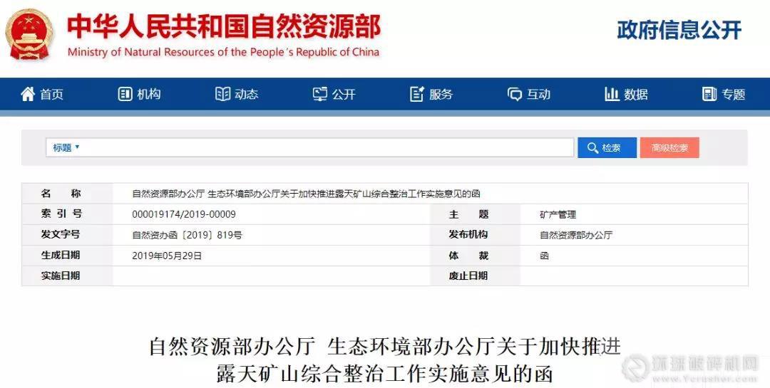 2019年5月29日,自然資源部辦公廳、生態環境部聯合發布《自然資源部辦公廳 生態環境部辦公廳關于加快推進露天礦山綜合整治工作實施意見的函》,要求:全面摸底排查露天礦山情況;依法開展露天礦山綜合整治;加強露天礦山生態修復;嚴格控制新建露天礦山建設項目。