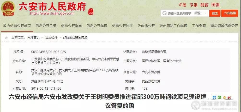 日前,安徽省六安市政府發布《六安市經信局六安市發改委關于王樹明委員推進霍邱300萬噸鋼鐵項目建設建議答復的函》。函稱:在執行有關藍天保衛戰三年行動計劃中 “原則上不允許新設立礦權露天開采”政策基礎上,探索搭建鋼架大棚封閉開采的可行性,爭取盡快將新中天水泥與四平山白云巖礦權整合為一體,啟動掛牌程序。