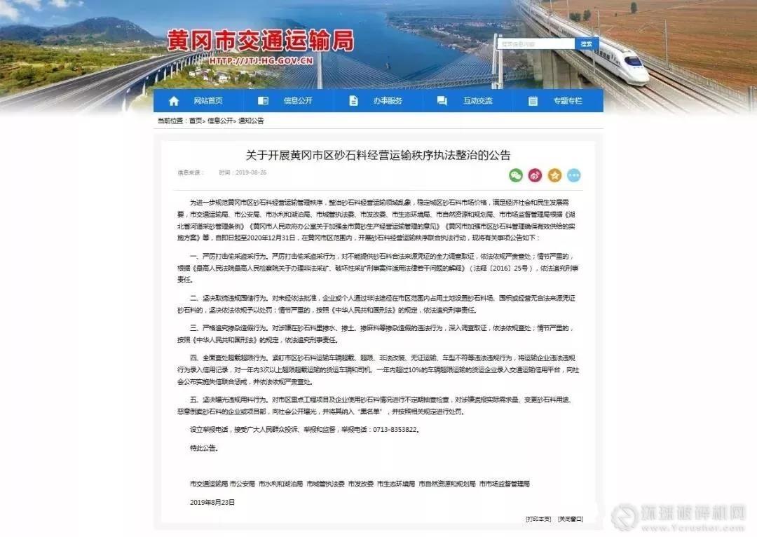 近日,河南沁陽取締29個非法囤砂銷售點,同時,湖北黃岡市交通運輸局發布《關于開展黃岡市區砂石料經營運輸秩序執法整治的公告》,也將取締違規囤儲列入整治重點內容。