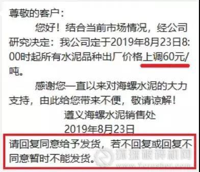 03、虎球水泥各客戶:根據(jù)當(dāng)前市場情況,經(jīng)公司研究決定,從8月25日0時開始,發(fā)往貴銷售區(qū)域的各等級品種袋、散水泥在原有價格基礎(chǔ)上上調(diào)20元/噸,特此通知!