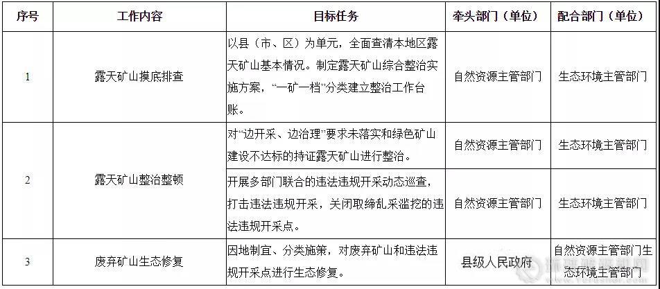 (一)全面開展露天礦山摸底排查。以縣(市、區)為單元,全面查清本地區露天礦山基本情況,在全面核查露天礦山開發利用、環境保護、礦山地質環境恢復治理和土地復墾等情況的基礎上,逐礦逐項登記匯總。以全面排查工作為基礎,制定縣(市、區)域露天礦山綜合整治實施方案,細化分解目標任務,科學安排指標進度,明確整治措施、責任主體和時間節點,“一礦一檔”建立露天礦山整治工作臺賬。
