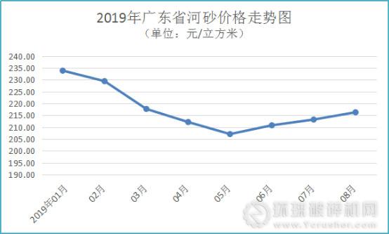 在國內多地采砂受限的背景下,廣東省內采砂總量遠遠不能滿足本省市場需求,采購省外砂石成本高且手續繁瑣,廣東全省砂石供需關系總體偏緊。受以上諸多因素影響,8月份廣東省河砂價格總體上升,碎石價格偏強運行,海砂和混凝土價格窄幅偏弱運行。鑒于短期內砂石市場供應量大幅增加的可能性較小,預計2019年9月廣東省砂石價格仍維持偏強走勢運行。