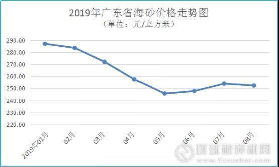 (三)海砂價格穩中有降。8月份廣東省海砂(淡化處理)價格為每立方米252元,環比下降0.61%。其中,粵北地區平均購進價格為每立方米225元,環比持平;珠三角地區平均購進價為每立方米272元,環比微降0.72%。