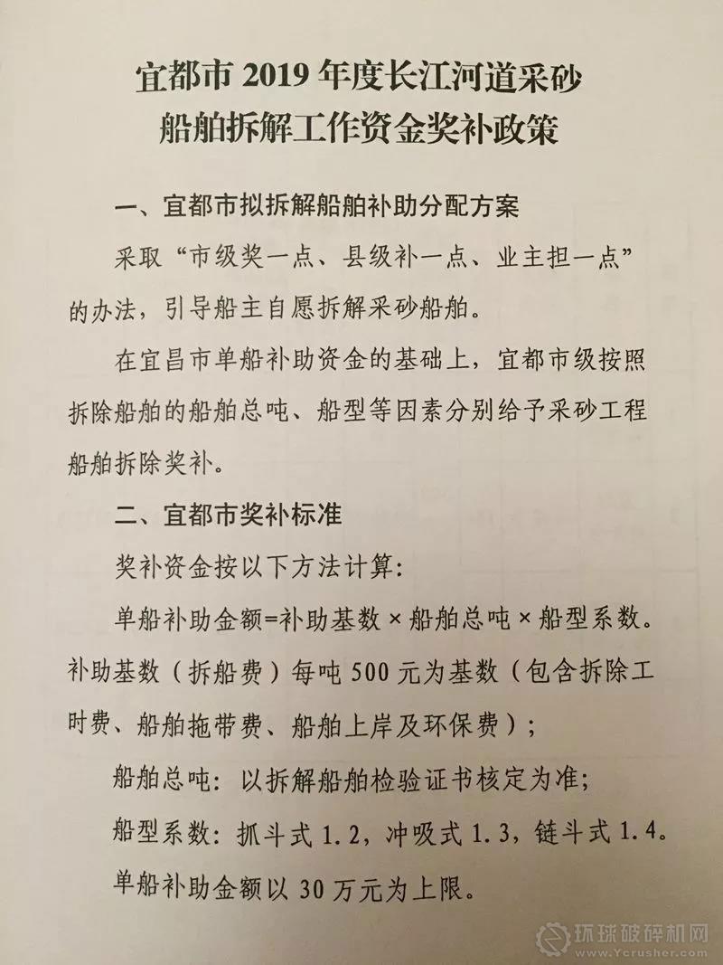 為消化過剩采砂工程船,今年宜昌市出臺了長江河道采砂船舶拆解方案,采取“市級獎勵一點、縣級補助一點、業主承擔一點”的辦法,引導船主拆解采砂工程船。