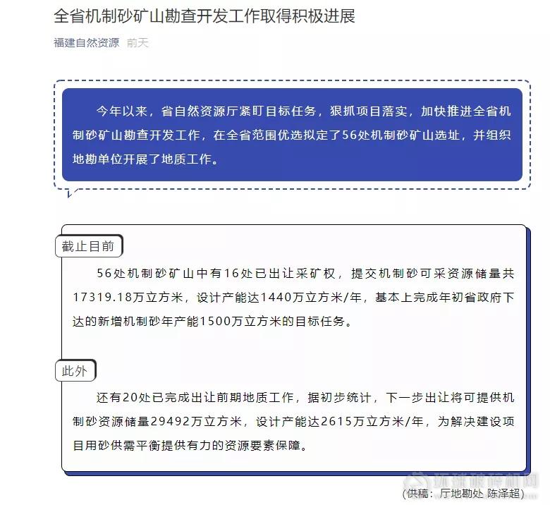 最近福建省自然資源廳公布了全省機制砂礦山勘查開發工作進展。