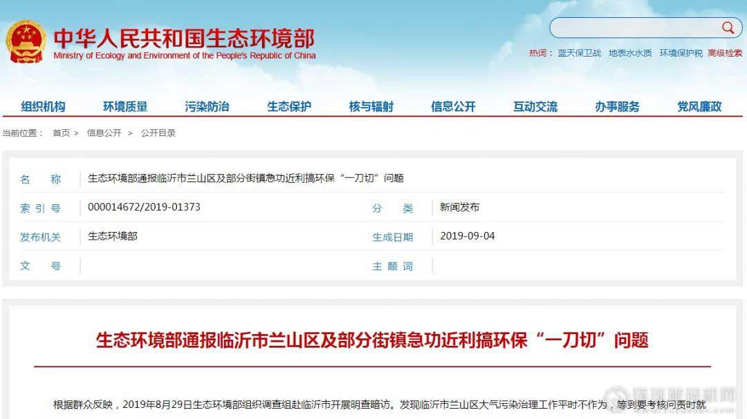 9月4日,生態環境部網站刊發《臨沂市蘭山區及部分街鎮急功近利搞環保“一刀切”問題》的文章,對山東省臨沂市蘭山區在環境保護中存在急功近利,搞環保“一刀切”等問題進行了通報批評。