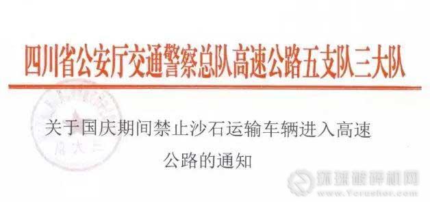 近日,四川省公安廳交通警察總隊發布《關于國慶期間禁止砂石運輸車輛進入高速公路的通知》紅頭文件,要求從2019年09月30日至2019年10月07日對砂石運輸車輛實行道路交通管制,交通管制時間、交通管制路段內,禁止所有運輸砂石車輛通行。