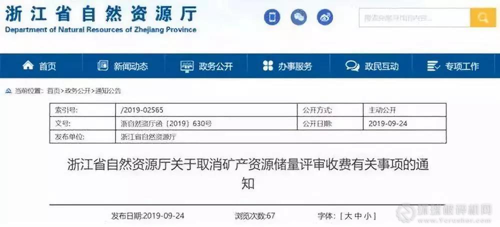 近日,浙江省自然資源廳發布《浙江省自然資源廳關于取消礦產資源儲量評審收費有關事項的通知》,通知顯示,自2019年10月1日起,浙江省將取消礦產資源儲量評審收費。