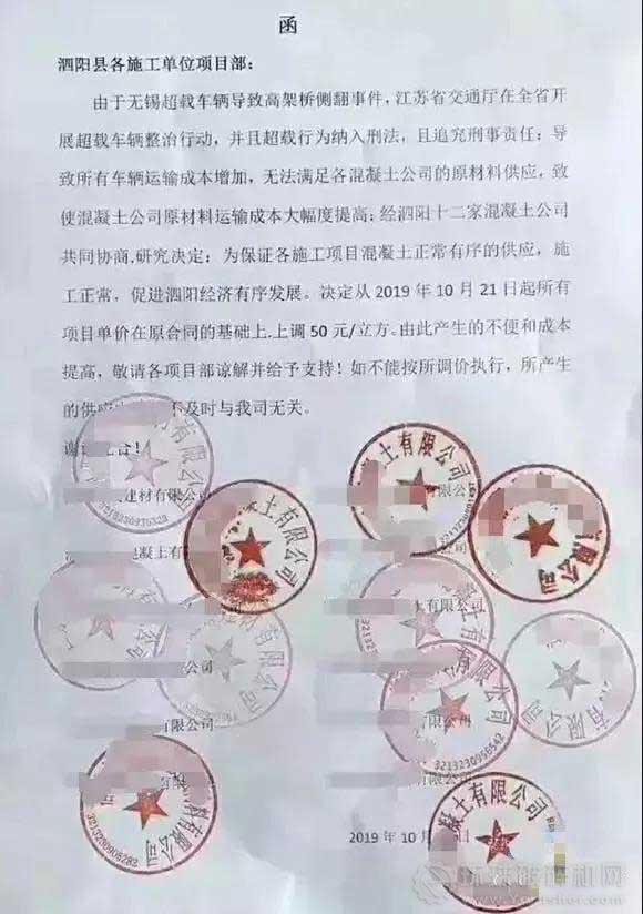 經江蘇省宿遷市泗陽十二家混凝土公司共同協商研究決定,從2019年10月21日起,所有項目單價在原合同的基礎上,上調50元/立方米。由此產生的不便和成本提高,敬請各項目部諒解并給予支持。如不能按所調價格執行,產生的供應中斷和不及時與我司無關。