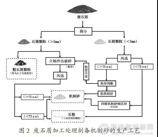 制砂機;小于0.75mm的篩分出來,保留一部分在砂中,過多的一部分作為石粉產品或適合的話作為摻合料進行使用。這與礦山開采“專門”生產機制砂還是有所不同,其需要使用經前一級破碎至5~16mm的顆粒進制砂機。因此,廢石屑制砂的生產工藝與“專門”生產機制砂有所不同。通過調研對比不同的生產工藝,包括專門開采巖石生產機制砂的各種生產工藝及相應的生產設備,分析了廢石屑制砂與其的不同之處,提出了一種適用于廢石屑進行加工處理制備機制砂的生產工藝,如圖。