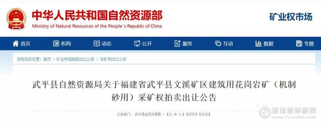 根據《中華人民共和國礦產資源法》、國土資源部《探礦權采礦權招標拍賣掛牌管理辦法(試行)》、《礦業權交易規則》、《自然資源部關于調整<礦業權交易規則>有關規定的通知》和《武平縣人民政府關于同意公開拍賣福建省武平縣文溪礦區建筑用花崗巖礦(機制砂用)采礦權的批復》(武政文〔2019〕195號),現就公開拍賣出讓福建省武平縣文溪礦區建筑用花崗巖礦(機制砂用)采礦權有關事宜公告如下: