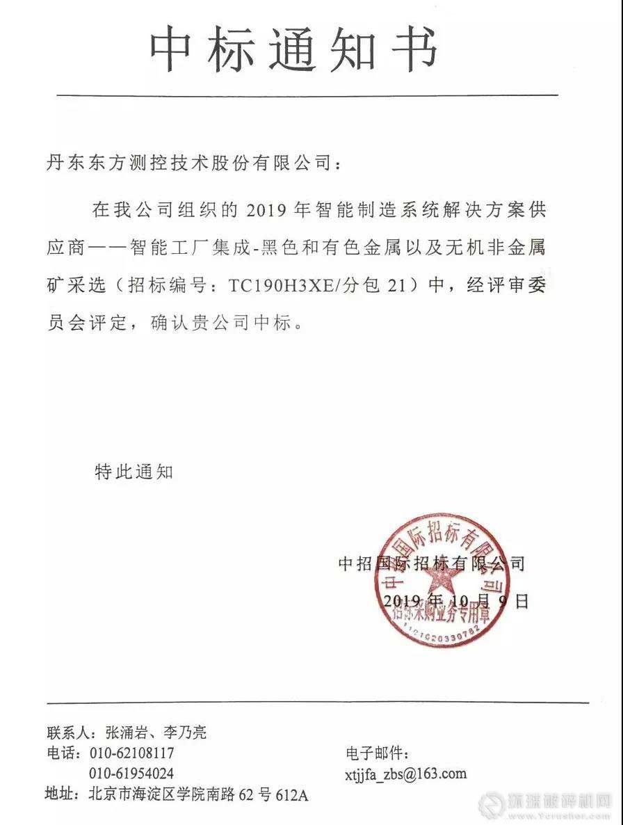 10月17日,中招國際招標有限公司發布公告,東方測控以總分第一名中標“2019年智能制造系統解決方案供應商——智能工廠集成——黑色和有色金屬以及無機非金屬礦采選項目”。