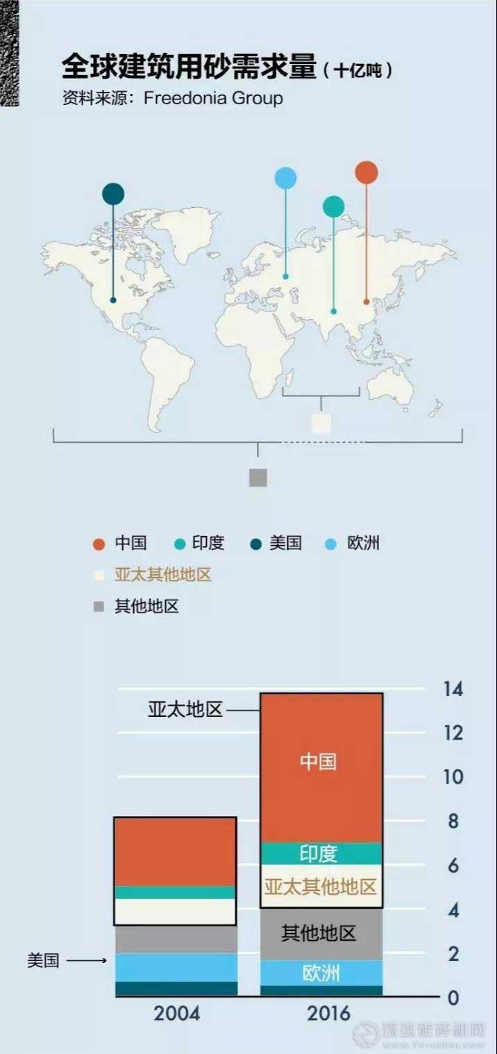 WWF報告指出,近些年世界砂石料開采的增長很大程度上來自亞太地區,其中以中國尤甚。據市場研究機構Freedonia Group估算的數據,2016年全世界采挖了137億噸建筑用砂,亞洲使用了七成,其中,光是中國一國就用掉了亞洲一半的量。