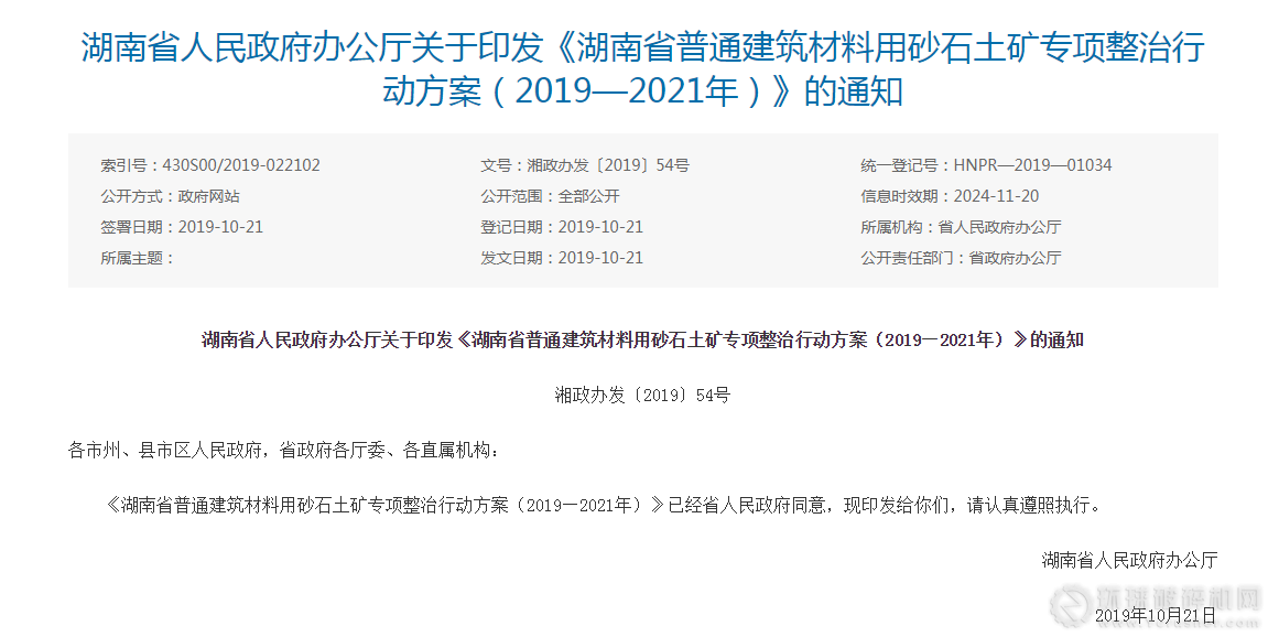 近日,湖南省政府辦公廳印發了《湖南省普通建筑材料用砂石土礦專項整治行動方案(2019—2021年)》,為加快推進生態文明建設,實現砂石土礦業綠色發展,從2019年至2021年底對全省砂石土礦進行專項整治。提出堅持生態優先、綠色發展,到2021年,全省砂石土礦總數減少近40%,全省綠色礦山達標率80%以上,其中新建礦山達標率100%。