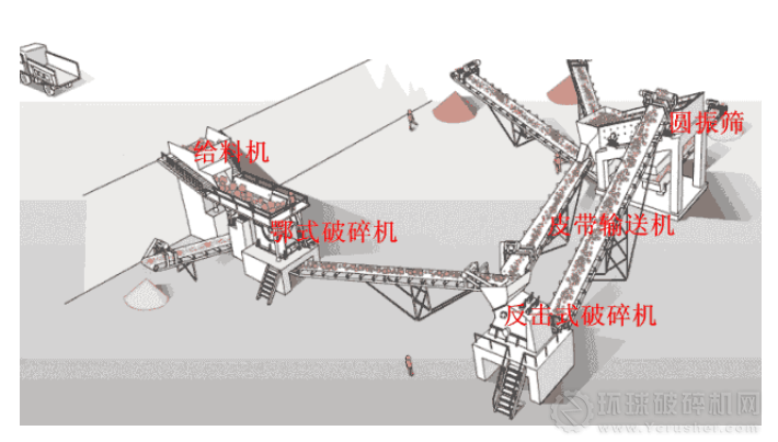 若物料規(guī)格尺寸較大,可選用顎式破碎機作為一級破碎;當石料規(guī)格尺寸較小,需要由一定級配的石料組成時,則需要選用聯(lián)合破碎篩分設(shè)備,如由顎式破碎機和圓錐或反擊式、錘式破碎機組成的聯(lián)合破碎設(shè)備。