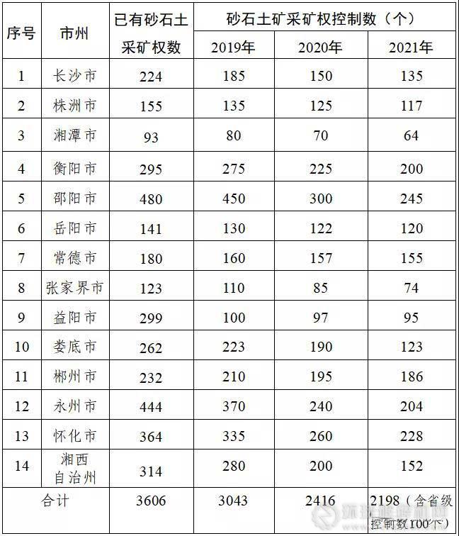 湖南省各市州砂石土礦采礦權控制數一覽表