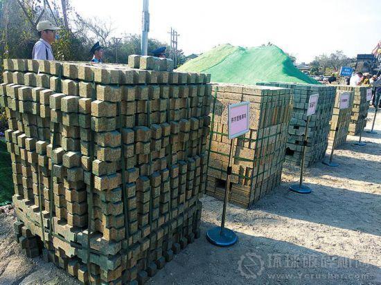 磚碴和水泥塊破碎篩分后制作出的透水磚、盲道磚、井字植草磚等再生品