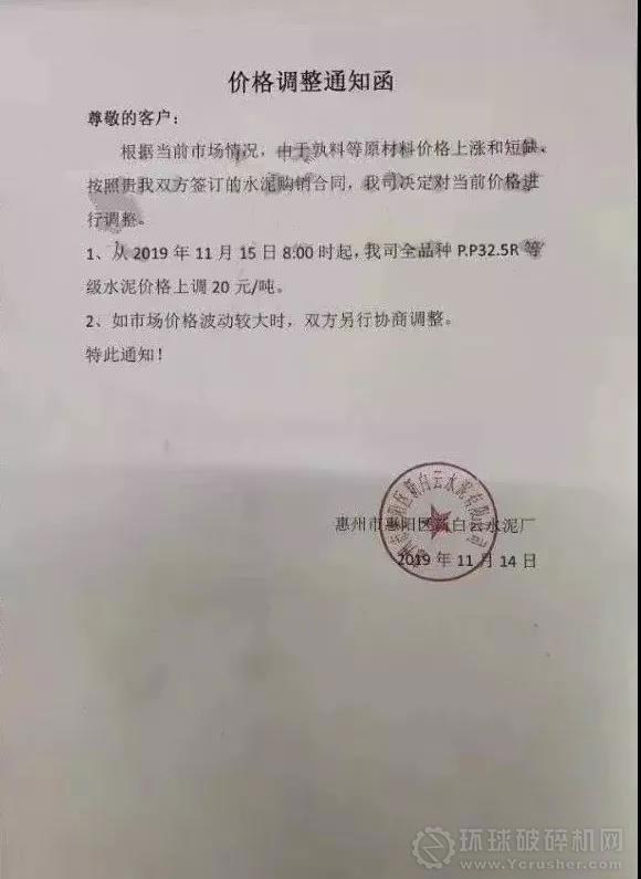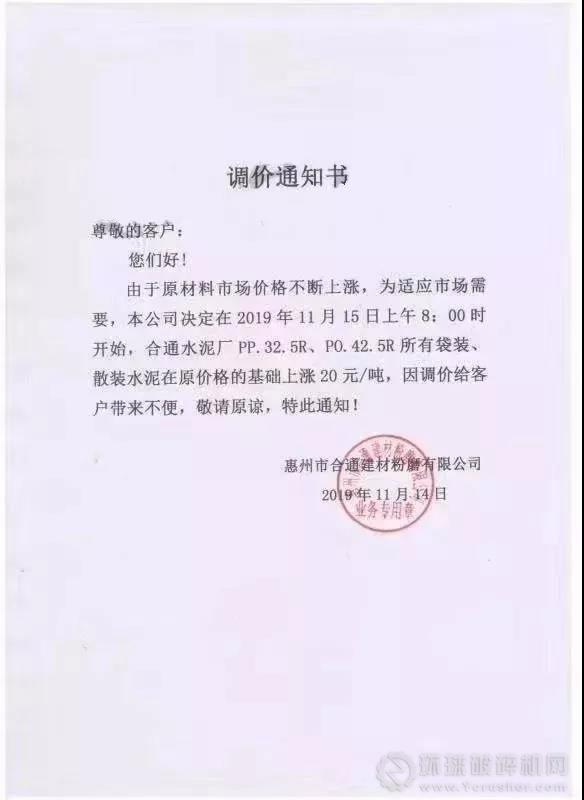 據了解,廣東地區臺泥、華潤、羅浮山等不同水泥企業發布漲價通知,宣布在11月15日上調水泥價格20元/噸。