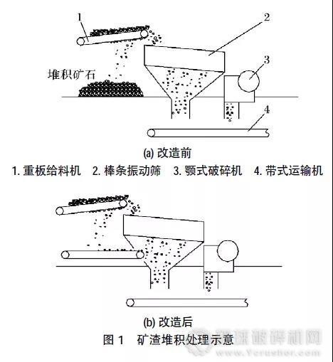 (1)如圖1所示,在重板給料機下方增加1臺帶式運輸機,給料機掉落的礦渣直接落在輸送機上,由其運送至振動篩下料口的輸送帶上,解決了重板給料機下方堆積凍結礦渣的現象。