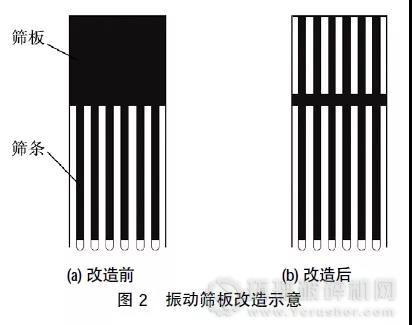 (2)振動篩落料處錳板寬1500mm,長1000mm,將該處的錳板加厚,并將錳板同棒條對齊割成條形,形成條形篩網,如圖2所示,解決了礦渣堆積現象,避免經常停車清理礦渣。